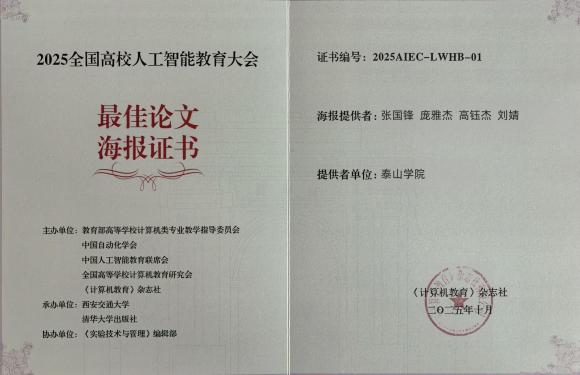 2025 年 10 月 17-19 日,由中国自动化学会、教育部高等学校计算机类专业教学指导委员会等联合主办,西安交通大学与清华大学出版社承办的2025 全国高校人工智能教育大会(AIEC2025)在西安召开。我院校级优秀基层教学组织嵌入式与物联网教学团队论文荣获优秀论文二等奖,论文海报荣获最佳论文海报,团队成员刘婧副教授和庞雅杰老师参会并领奖。