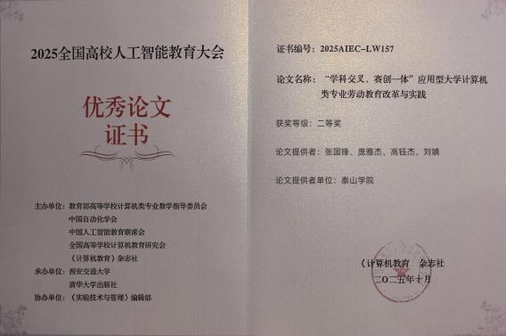 团队论文《“学科交叉、赛创一体” 应用型大学计算机类专业劳动教育改革与实践》,以泰山学院计算机类专业的双创教育与劳动教育一体化推进为实践对象,探索了“学科交叉、赛创一体”劳动教育改革路径,通过“三融合”框架有效破解了应用型大学计算机类专业劳动教育的四维困境,实现了劳动育人、专业建设和社会服务三方面的有机衔接。